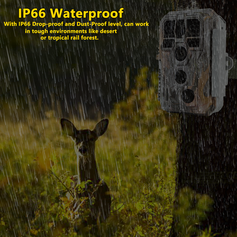 Diese zuverlässige, robuste und wasserdichte Kamerafalle ist IP66-zertifiziert (staub-, fall- und regenfest). Die Kamera kann in jeder Umgebung, wie z. B. in der Wüste oder im Regenwald, zu allen Jahreszeiten für die Jagd, Überwachung, Sicherheit oder Tierbeobachtung eingesetzt werden.